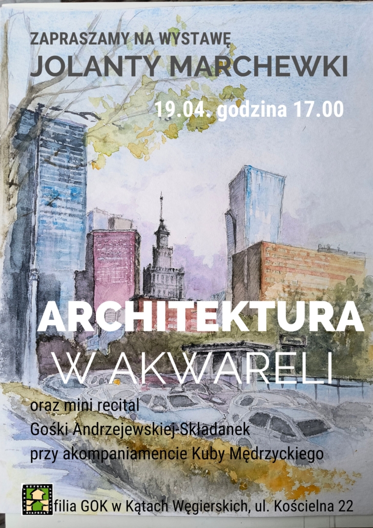 Zapraszamy na wystawę malarstwa Jolanty Marchewki „Architektura w akwareli” oraz mini recital „Bo to się zwykle tak zaczyna” w wykonaniu Gośki Andrzejewskiej – Składanek przy akompaniamencie Kuby Mędrzyckiego, 19 kwietnia o 17.00 w Kątach.