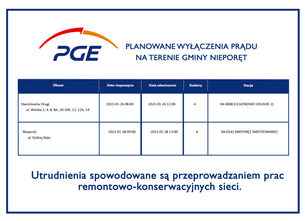 PGE informuje o planowanych wyłączeniach prądu na terenie gminy Nieporęt